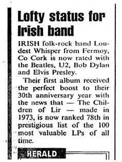 With Perseus enjoying an extremely warm reception, and a single and album ready for release, Loudest Whisper seemed set for the big time. Things were not to go so smoothly, though. First, when Polydor Ireland’s MD presented the tapes of The Children of Lir to his British counterpart, he was met by complete indifference. As Brian ruefully puts it, “when the UK branch of Polydor rejected it, enthusiasm in Ireland melted away too. It was very disappointing.”